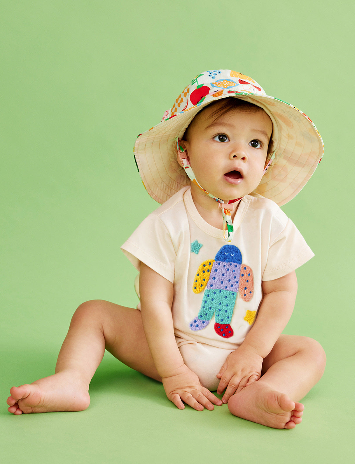 Features a boxy fit, snap closure, and our friendly summer motifs.