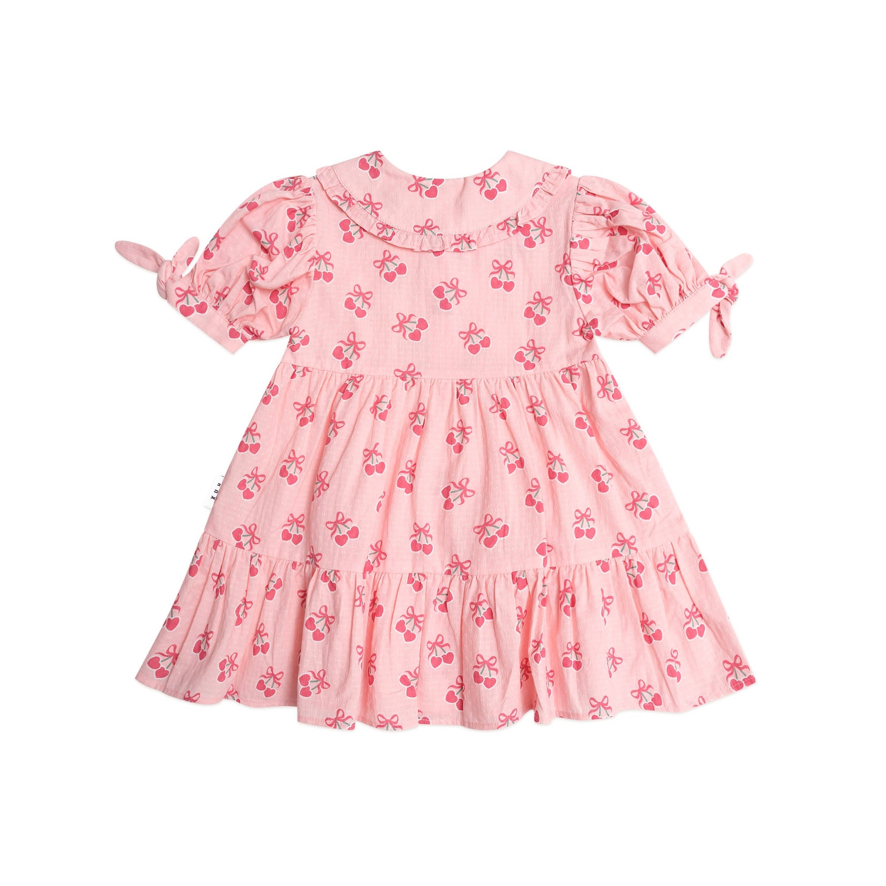 It’s the festive cherry pie dress of the silly season. Made from 100% organic cotton, it features a peter pan style frilly collar, fabric buttons, a full, tiered skirt and exaggerated puff sleeves.
