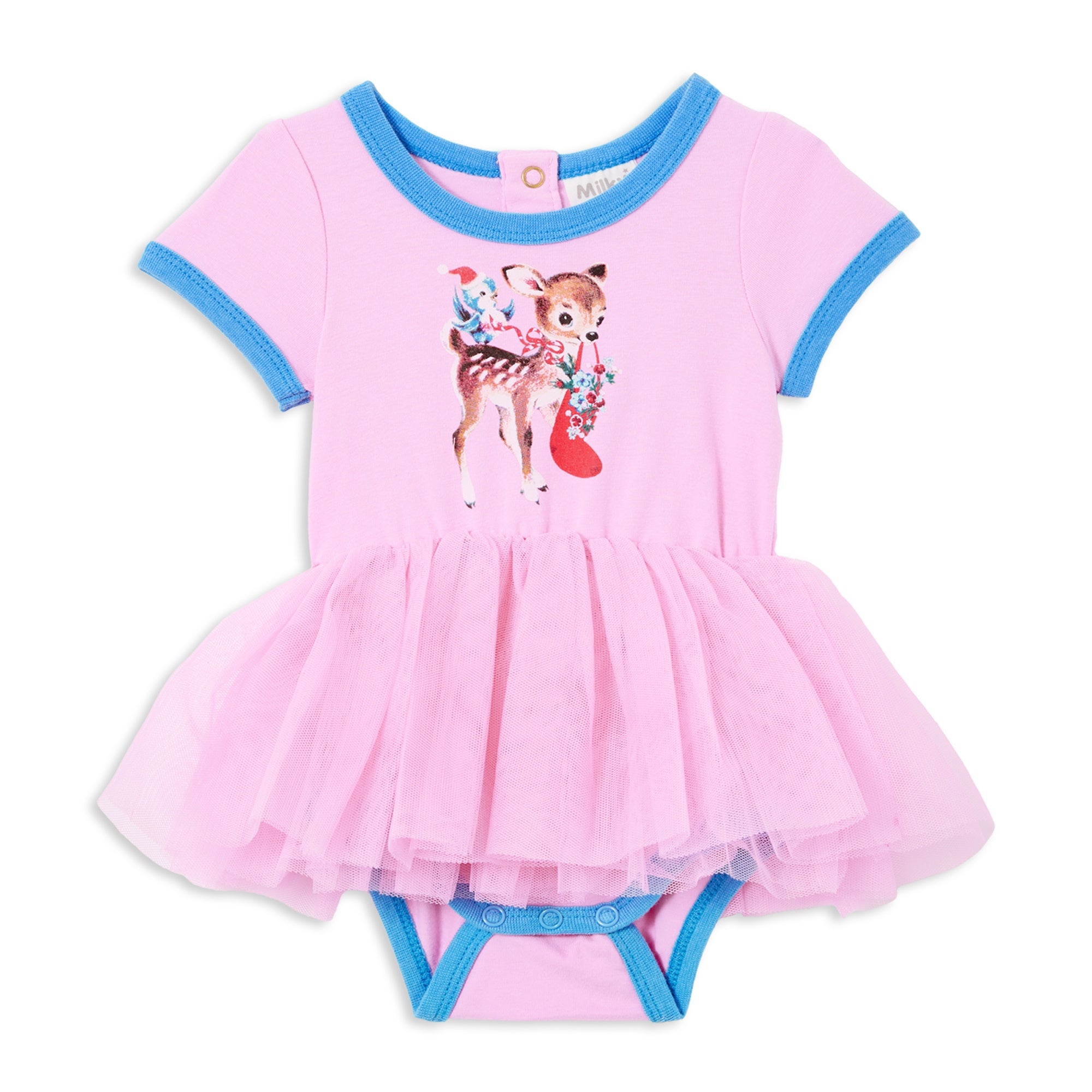 Milky Clothing Festive Friends Baby Dress is a sweet addition to your little ones wardrobe. This adorable dress showcases a charming deer carrying a Christmas stocking, set against a soft pink background with delicate blue ribbing around the neckline, leg opening and sleeves. Designed to offer both comfort and whimsical charm, it's perfect for keeping your little one festive and cheerful throughout the holiday season.