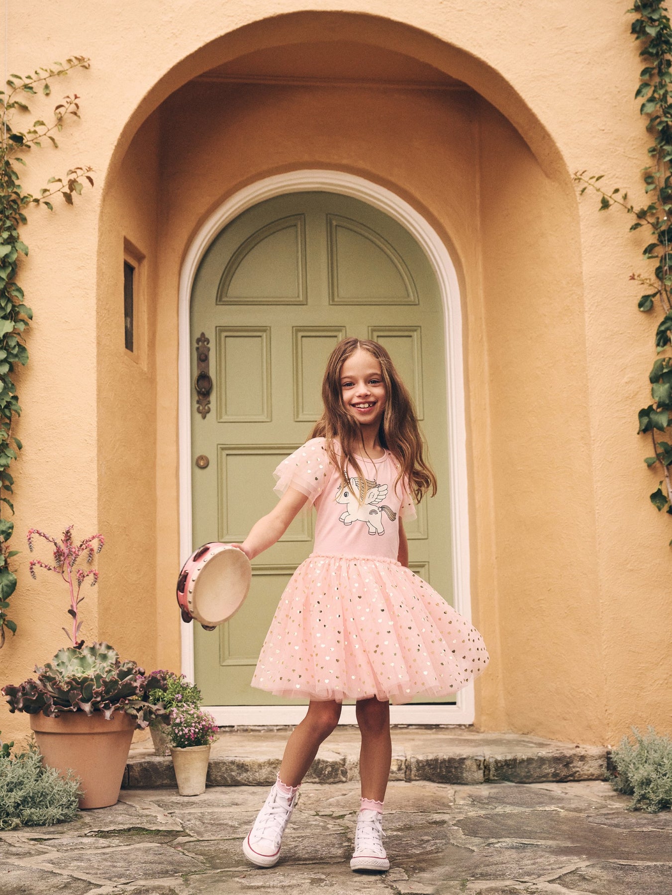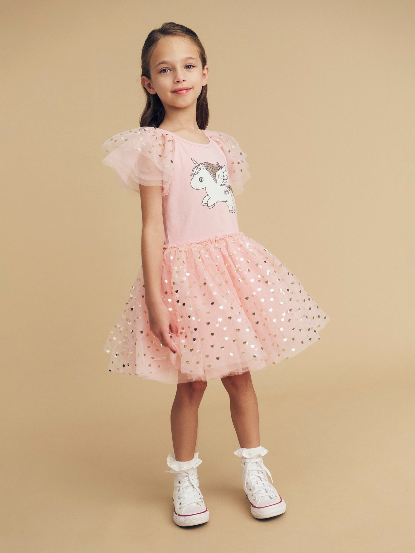 • Glitter unicorn ballet dress with layered tulle sleeves and all over gold foil heart print on tulle