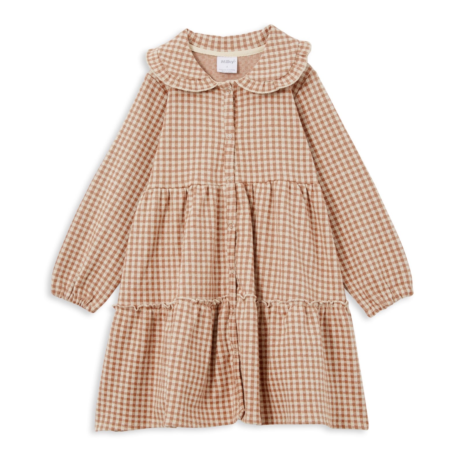 Milky Clothing Check Tiered Collared Dress. This check dress will soon become your little one's favourite. It can be paired with tights and a jacket or worn alone. This style can be dressed up for a fancy occasion or perfect for a play date with friends.