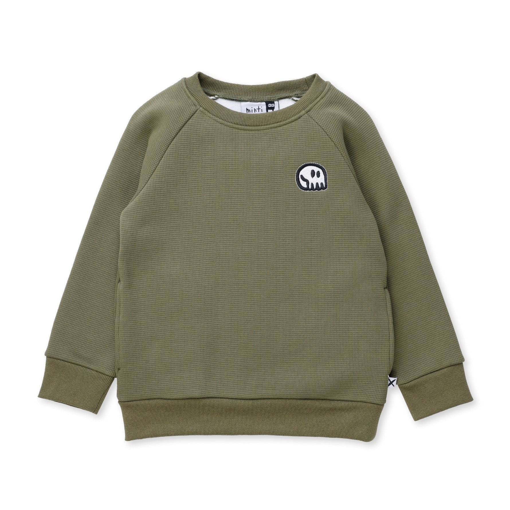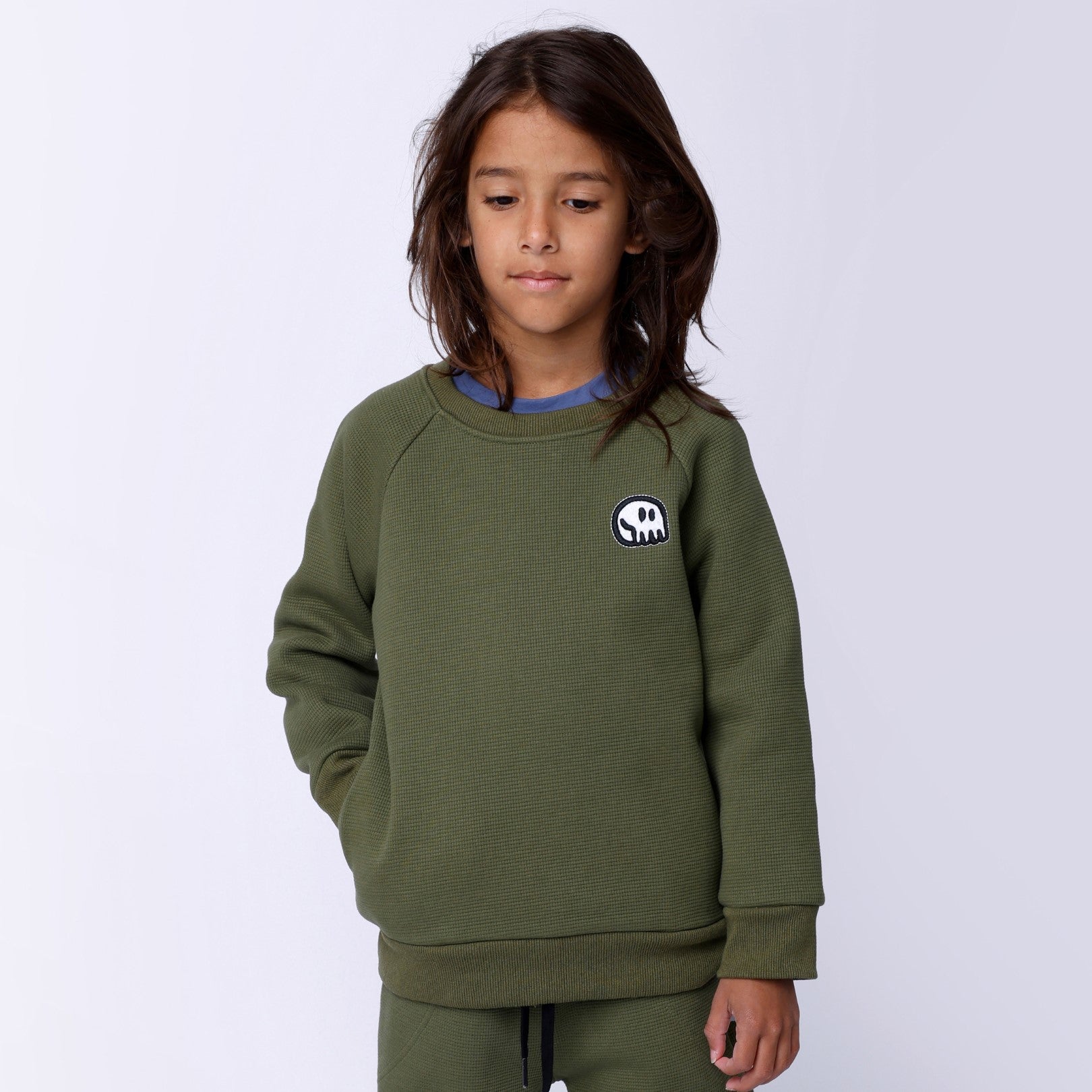 Cosy sweat in brushed waffle making it super soft and warm. Hidden side pockets and super cute patch. 100% Cotton.