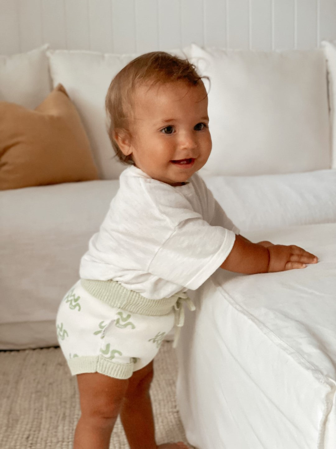 These thin knit bloomers featuring Ziggy Lou's printed Waves design and have an elastic waist and functional drawstring. Mix and match with their Waves Summer Collection.