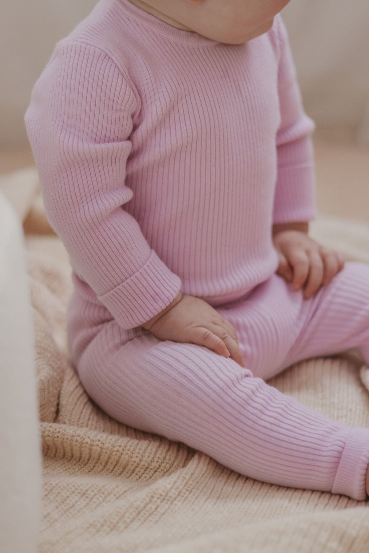 Ribbed, long sleeve, bodysuit. Functional press snaps at crotch for easy nappy changes and press snaps on shoulder for easy on/off. Matches perfectly with our lilac leggings and compliments our Flora Winter Collection.