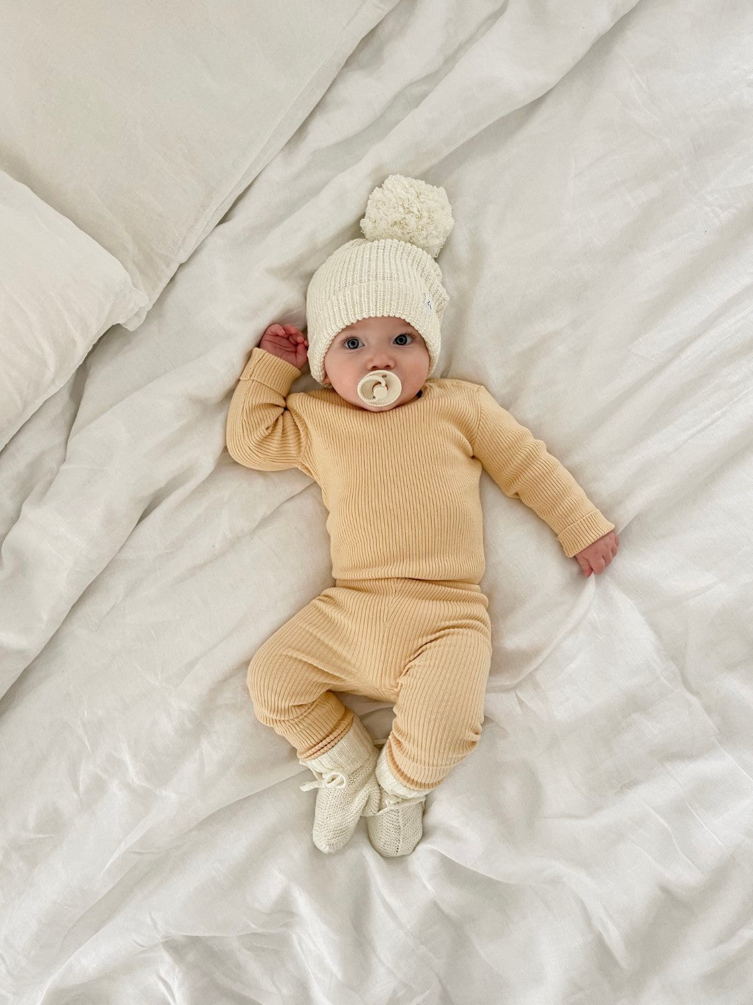 Ribbed, long sleeve, bodysuit. Functional press snaps at crotch for easy nappy changes and press snaps on shoulder for easy on/off. Matches perfectly with our mango leggings and robbed top. Mix and match with our Malu or Poppy Winter Collections.