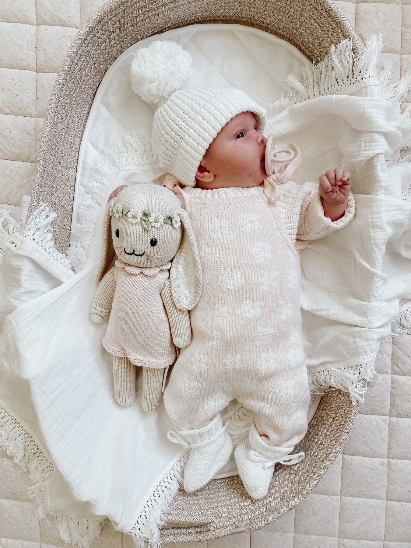 Knitted booties to complement our knitted rompers & bonnets. Designed to be a timeless keepsake to remember just how teeny, tiny they were. An heirloom piece to pass down to other siblings or a special something to pop in their keepsake box. Functional drawstring to ensure booties don't fall off when worn. Matching romper also available.
