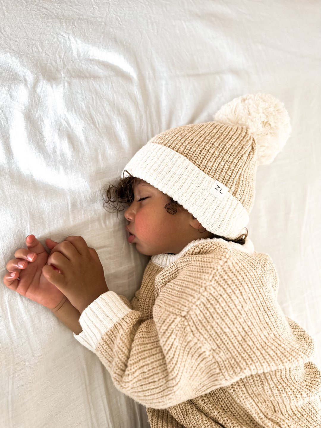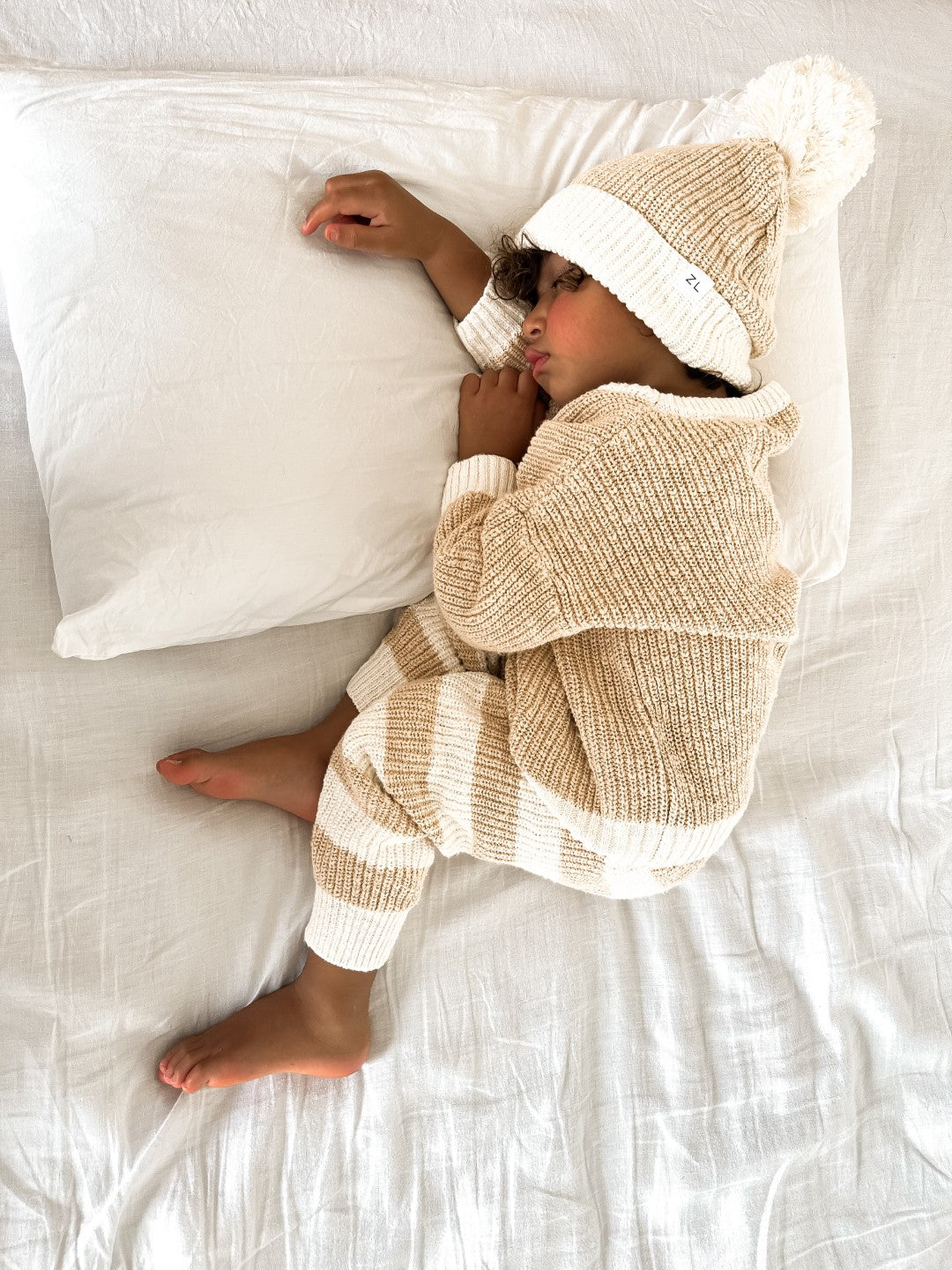 Our beautiful two tone chunky knit, Wheat + Coconut jumper is the perfect year round staple in your little one's wardrobe. Matching two tone beanie + pants also available.
