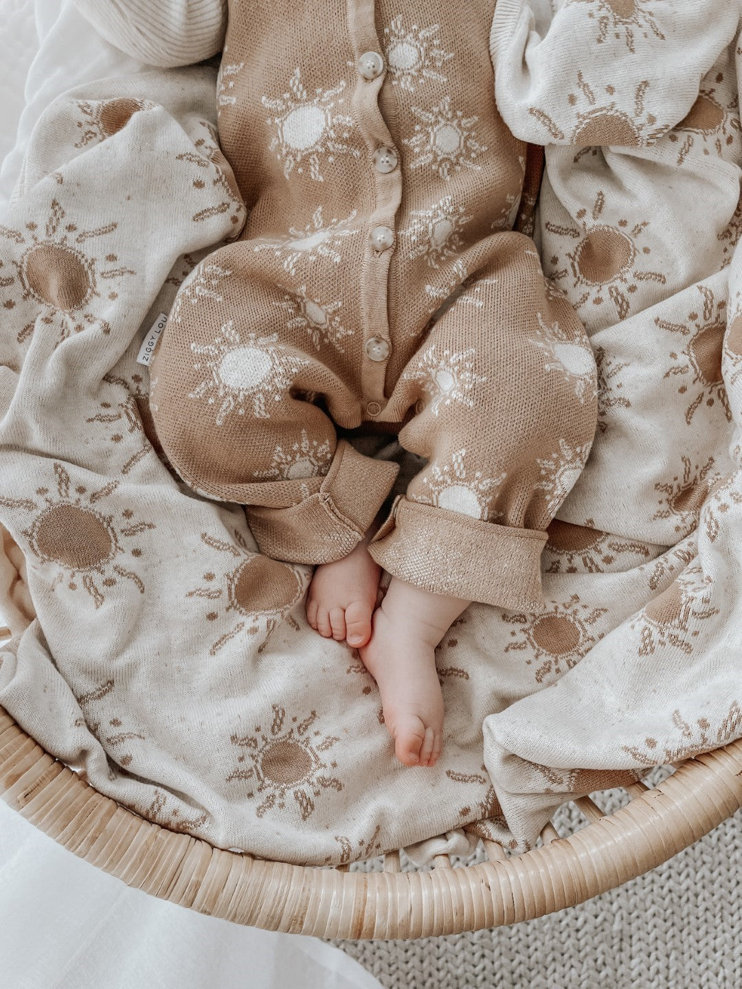 Our Suns Jumpsuit is our beautiful Maple colour featuring our Suns design in Biscotti Fleck. Designed to be a comfortable piece, perfect for layering on the cooler days, or on its own in the warmer days. Press snaps at crotch for easy nappy changes and buttons down the front for easy on/off. Mix and match with our Biscotti Fleck & Suns Winter Collections.
