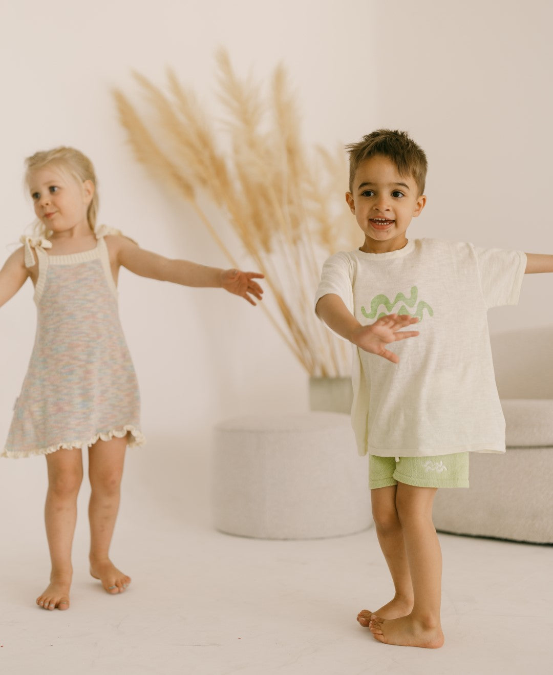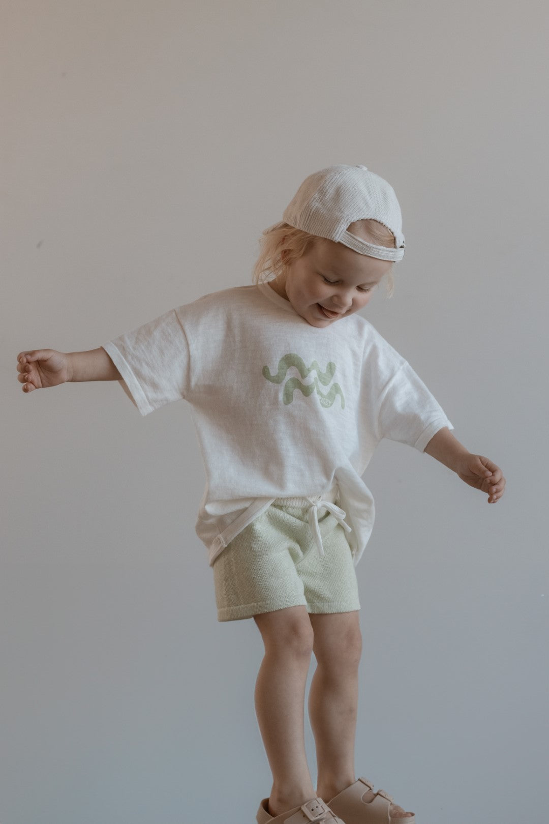 These thin knit shorts are the perfect addition for your little one's summer outfit. Featuring an embroidered wave on the leg, an elastic waist and functional drawstring. Mix and match with items from Ziggy Lou's Waves and Lime Summer Collections.
