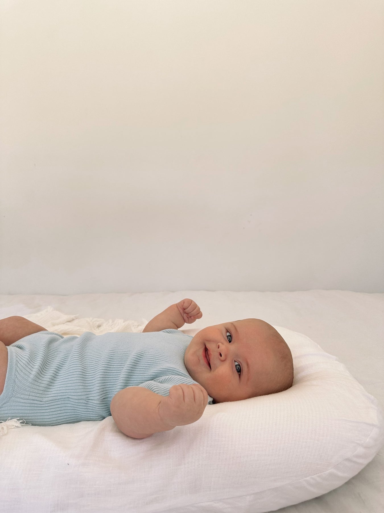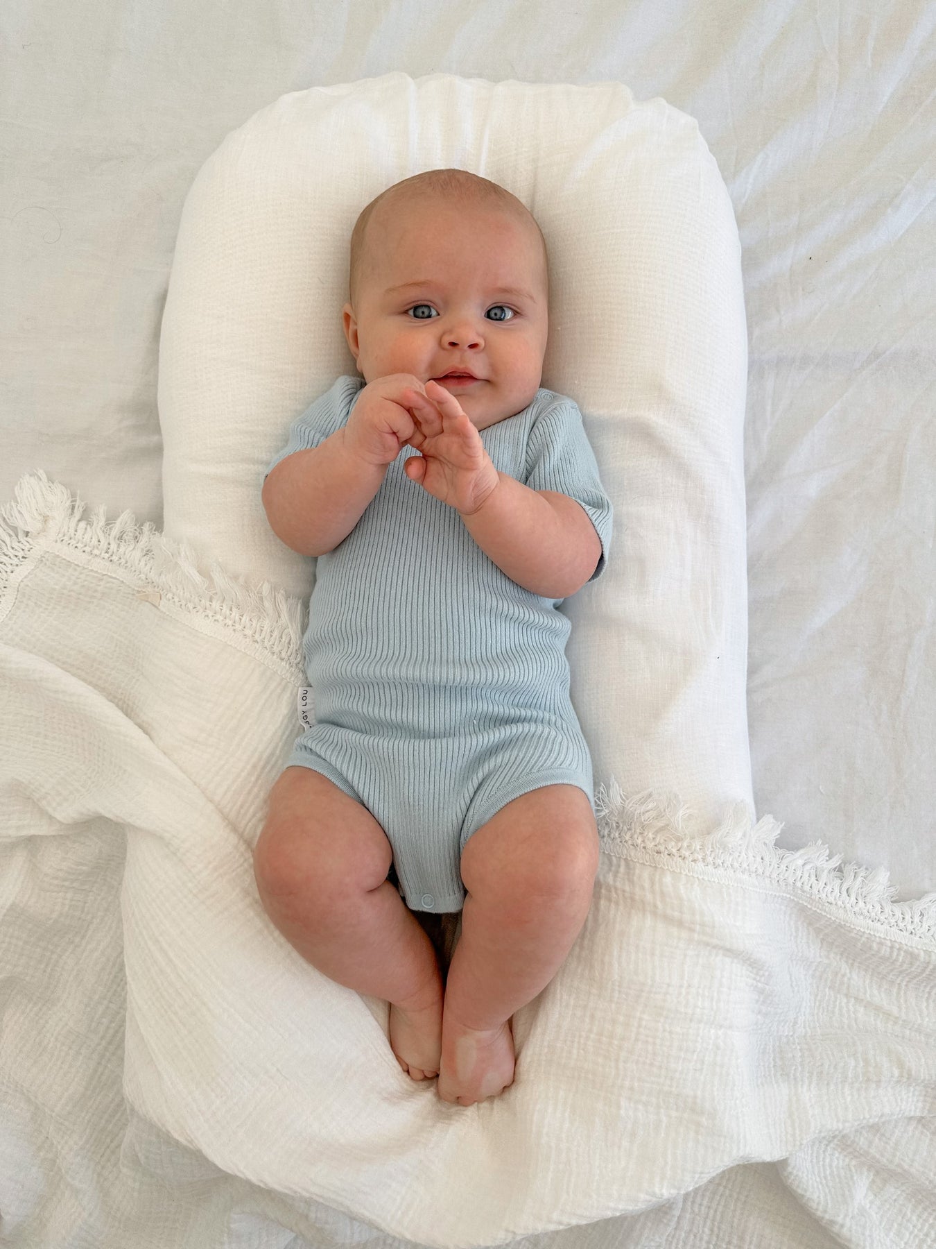 Ribbed short sleeve bodysuit with gorgeous frill cuff on sleeves. Functional press snaps at crotch for easy nappy changes and press snaps on shoulder for easy on/off. Mix and Match with the Rio Summer Collection.