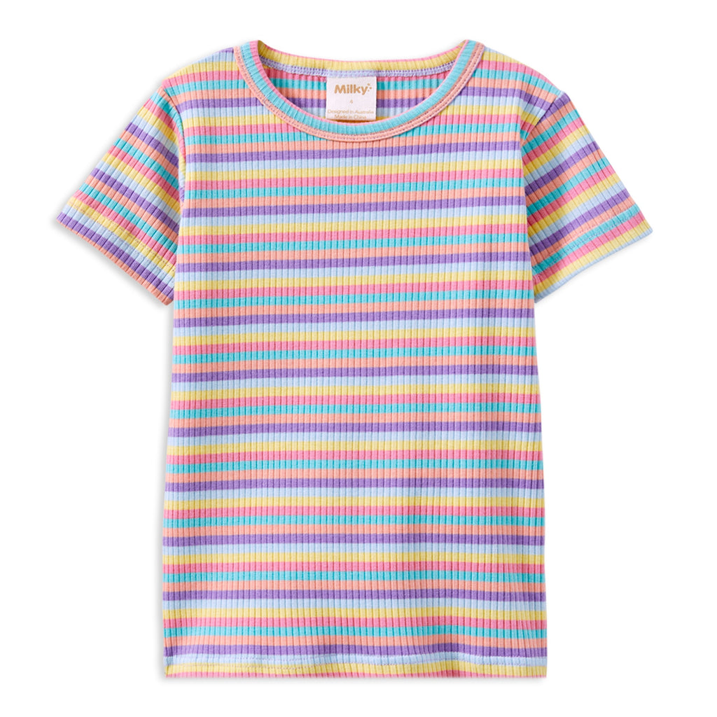 Milky Clothing Multi Stripe Rib Tee is a versatile essential for your summer wardrobe. Crafted from a stripe rib, this timeless piece offers effortless style for any occasion. Featuring a classic round neckline and short sleeves. Pair it with your favorite Milky shorts or skirt for a casual look, or layer with pants and a cardigan when the weather cools down. Available in many charming colors, this tee is designed to withstand wash after wash, promising lasting comfort and style.