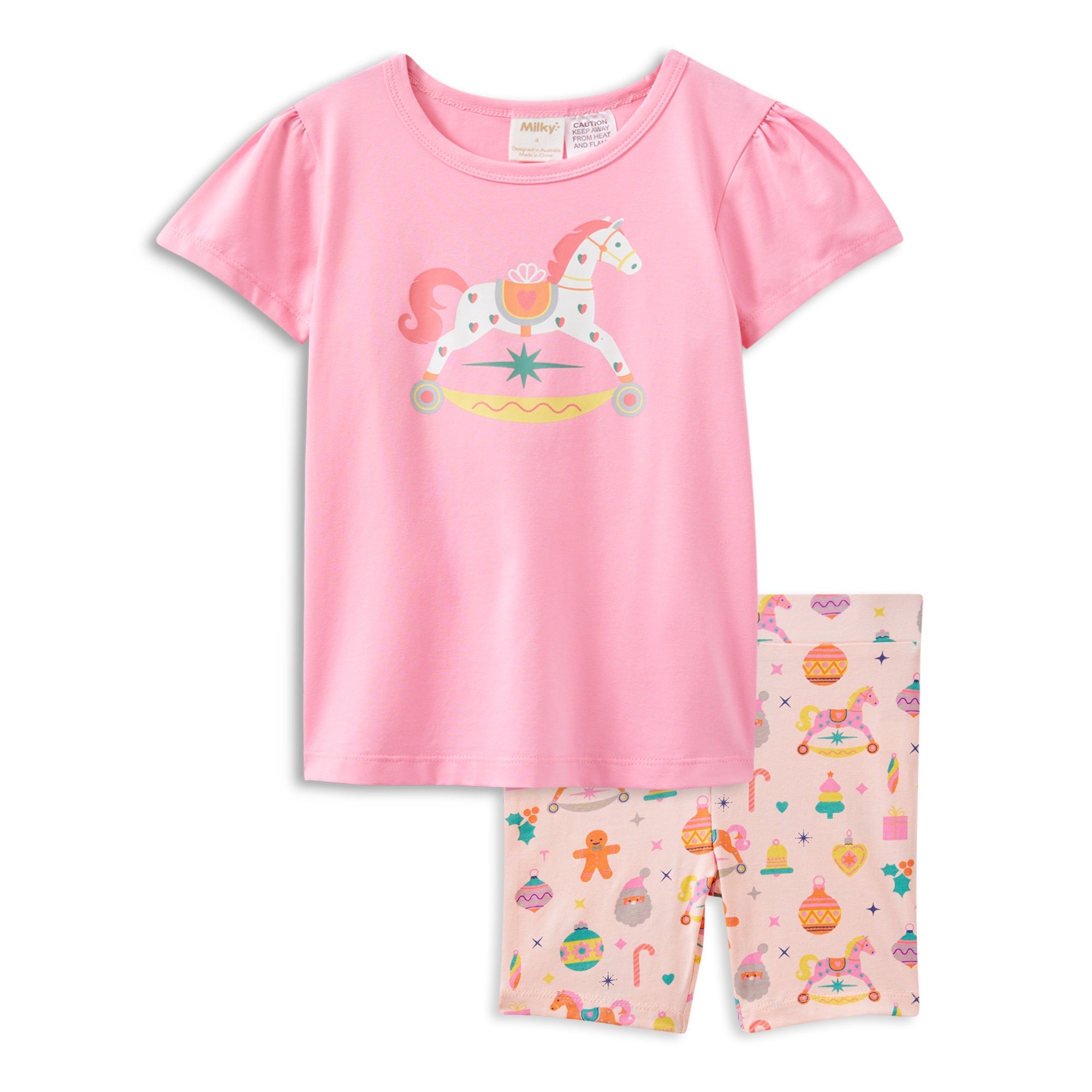 Milky Clothing Rocking Horse PJ’s bring a touch of nostalgia to Christmas sleepwear. Featuring a soft pink top with a charming rocking horse print and matching bike short-style bottoms with an all-over Christmas-themed print, this set is perfect for festive mornings and cosy nights. With family matching outfits available across the range, coordinated Christmas dressing has never been easier.