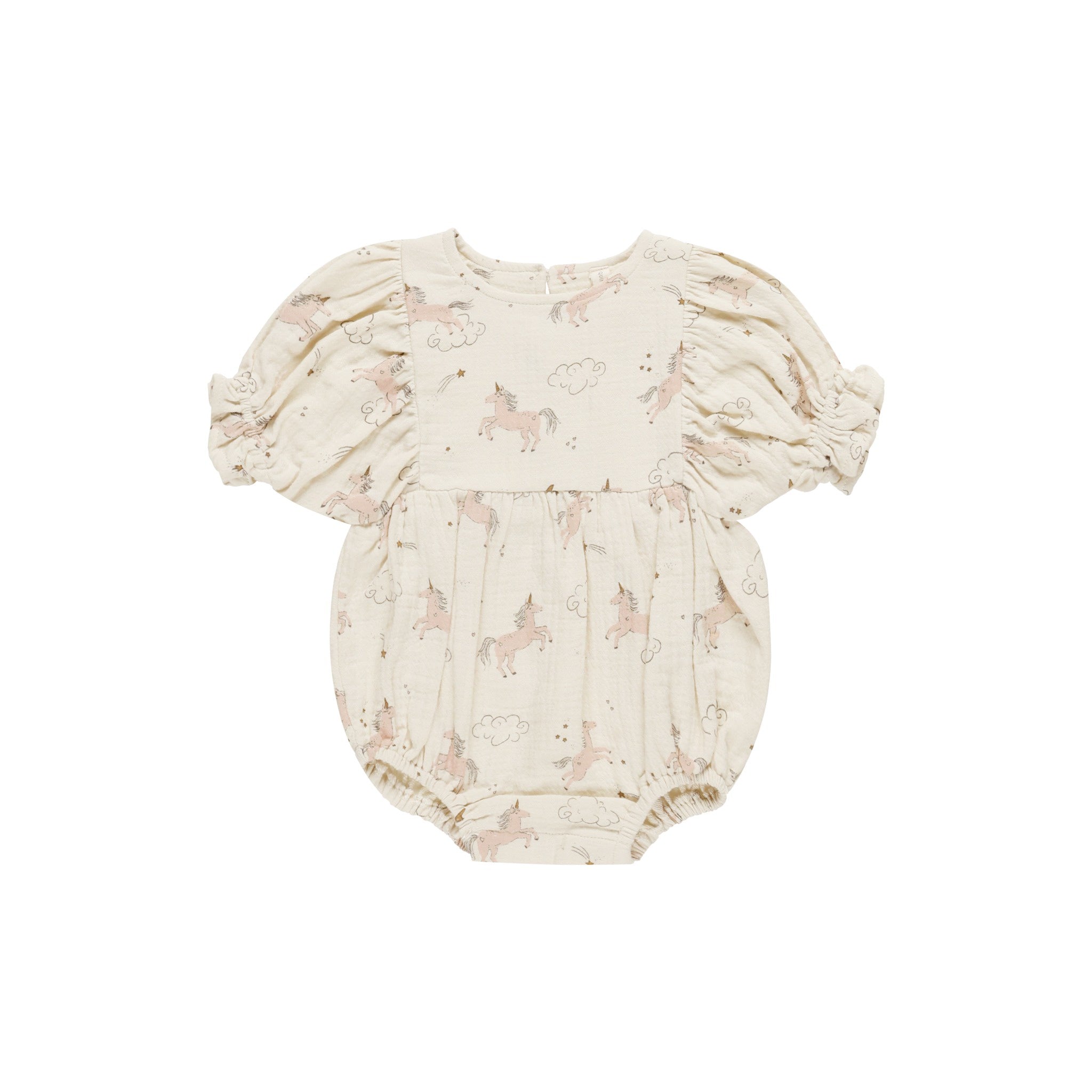 The Cosette Romper is created with a lightweight cotton gauze making it the perfect layerable outfit to transition into cold weather. Oversized and gathered balloon sleeves, elastic ruffle trim, gathered waist, and hidden snaps add all the perfect details.