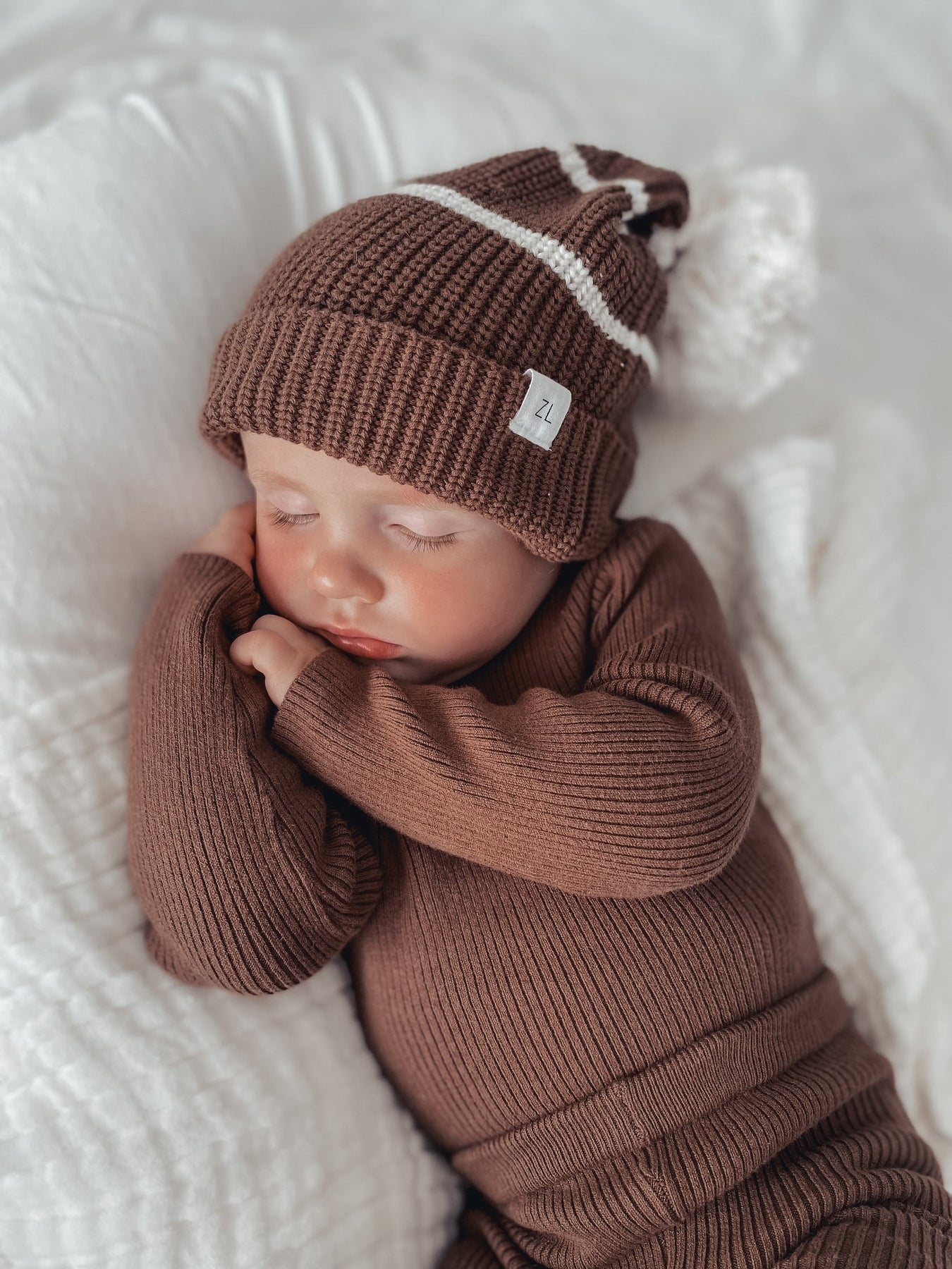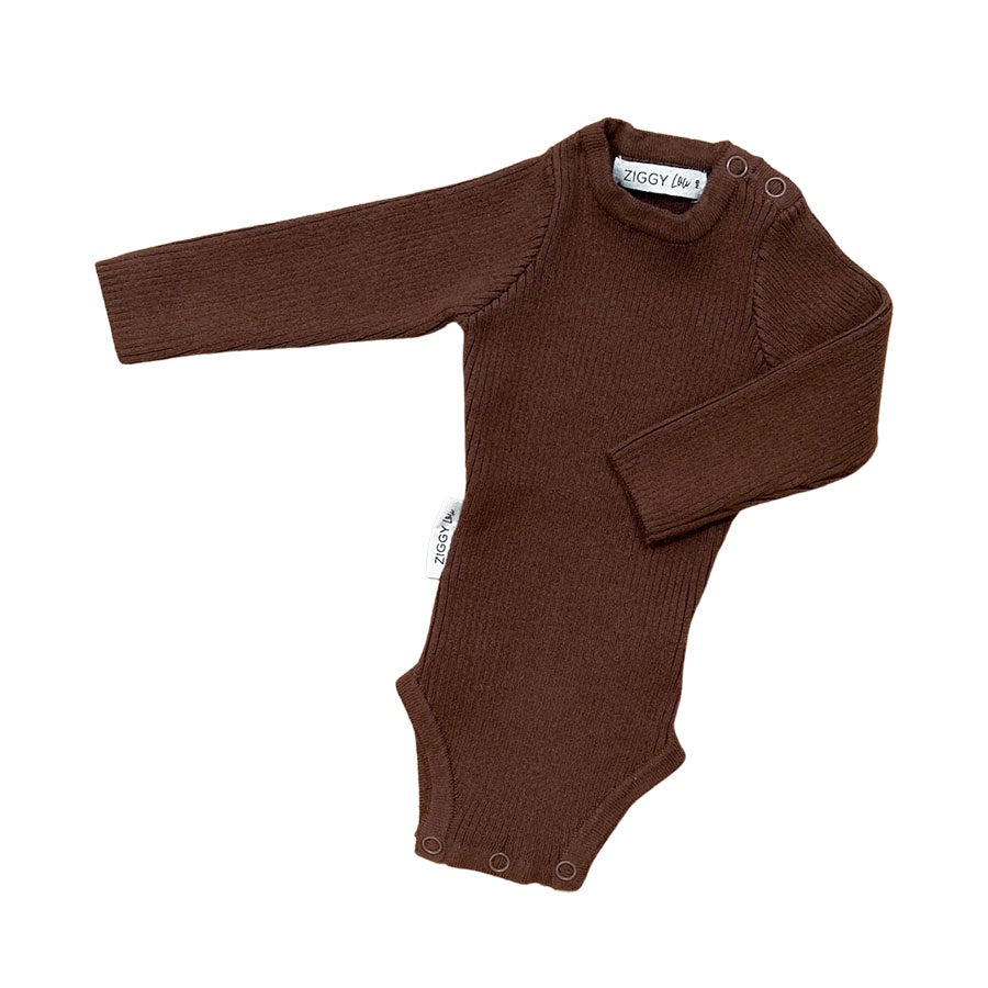 Ribbed, long sleeve, bodysuit. Functional press snaps at crotch for easy nappy changes and press snaps on shoulder for easy on/off. Matches perfectly with our chocolate leggings.